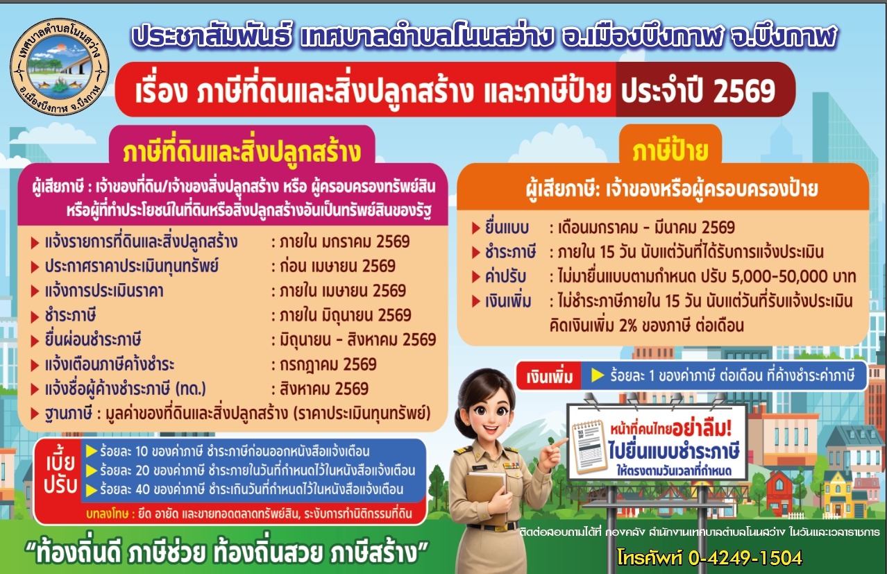 ประชาสัมพันธ์ การชำระภาษีที่ดินและสิ่งปลูกสร้าง และภาษีป้าย ประจำปี 2569
